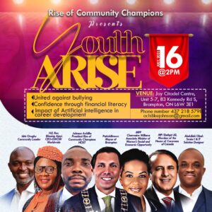The Youth Arise 2023 Conference, organized by Rise of Community Champions, was held on July 16, 2023, at Joy Citadel Centre, Brampton, ON, Canada. This transformative event focused on empowering young individuals through insightful discussions on bullying prevention, financial literacy, and the role of artificial intelligence in career development.
